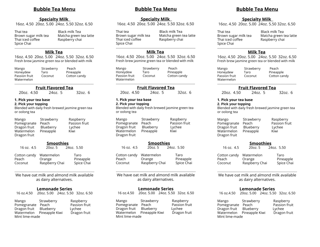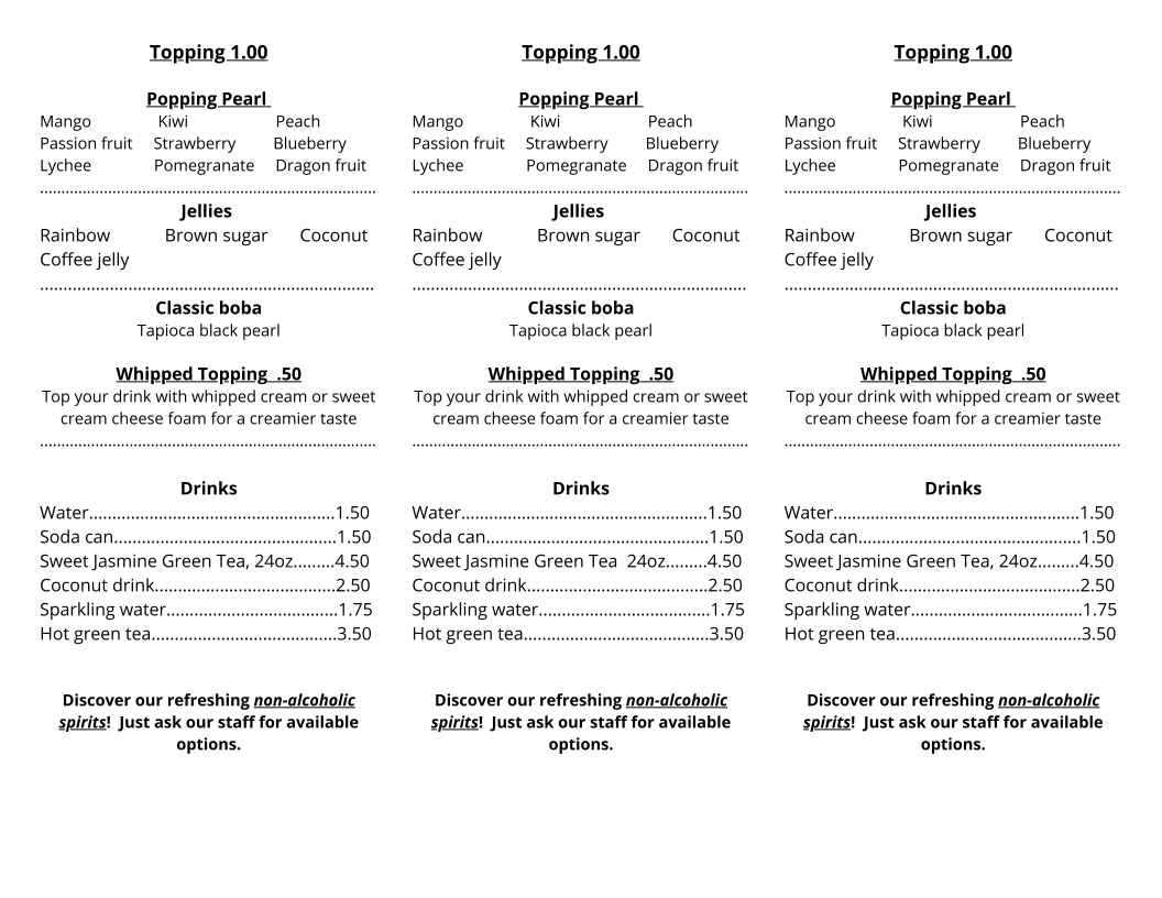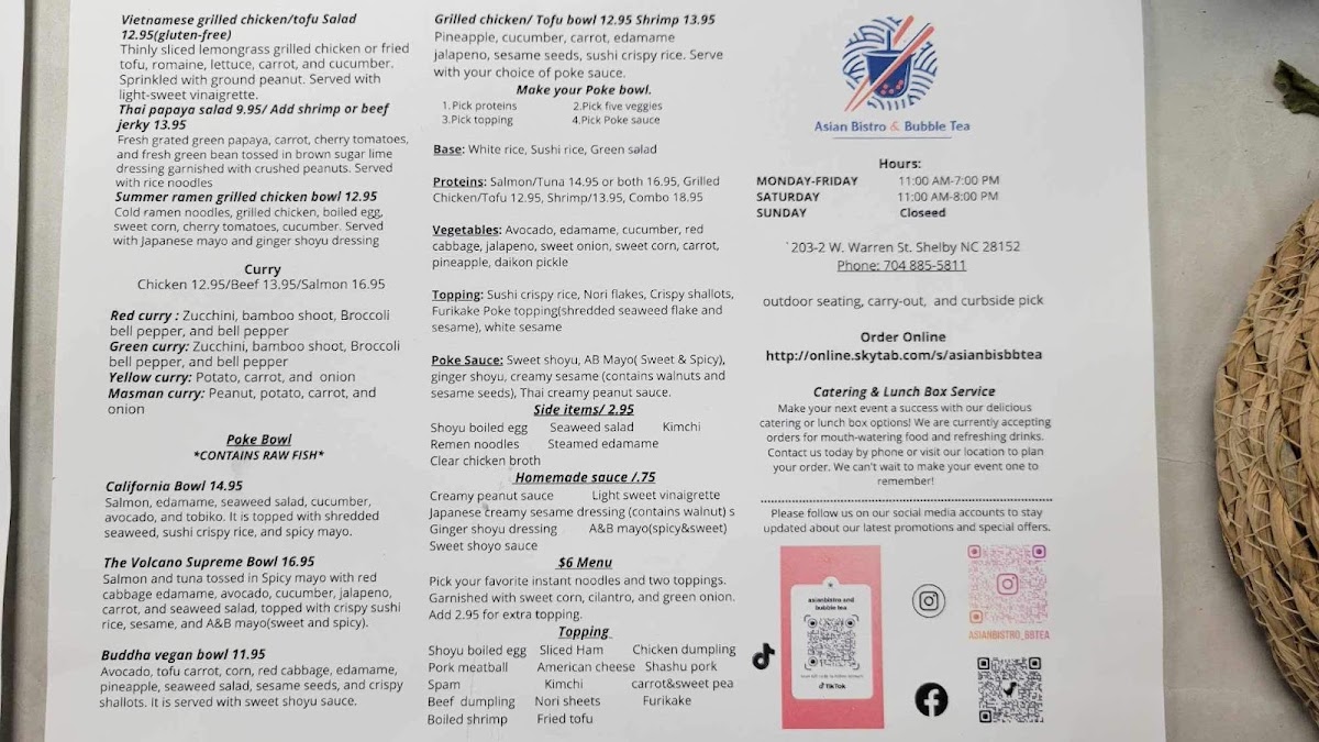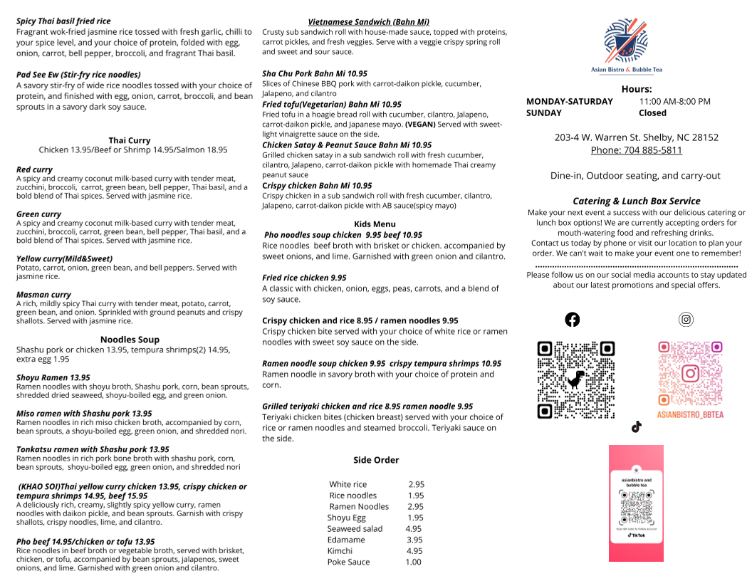 Step right up to the Asian Bistro & Bubble Tea Menu, where every bite is a little adventure waiting to happen. Whether you're craving savory stir-fries, perfectly seasoned dumplings, or a comforting bowl of ramen, this menu has you covered. The bubble tea selection is just as tempting, with flavors ranging from classic milk teas to fruity concoctions that practically sparkle in your hand.